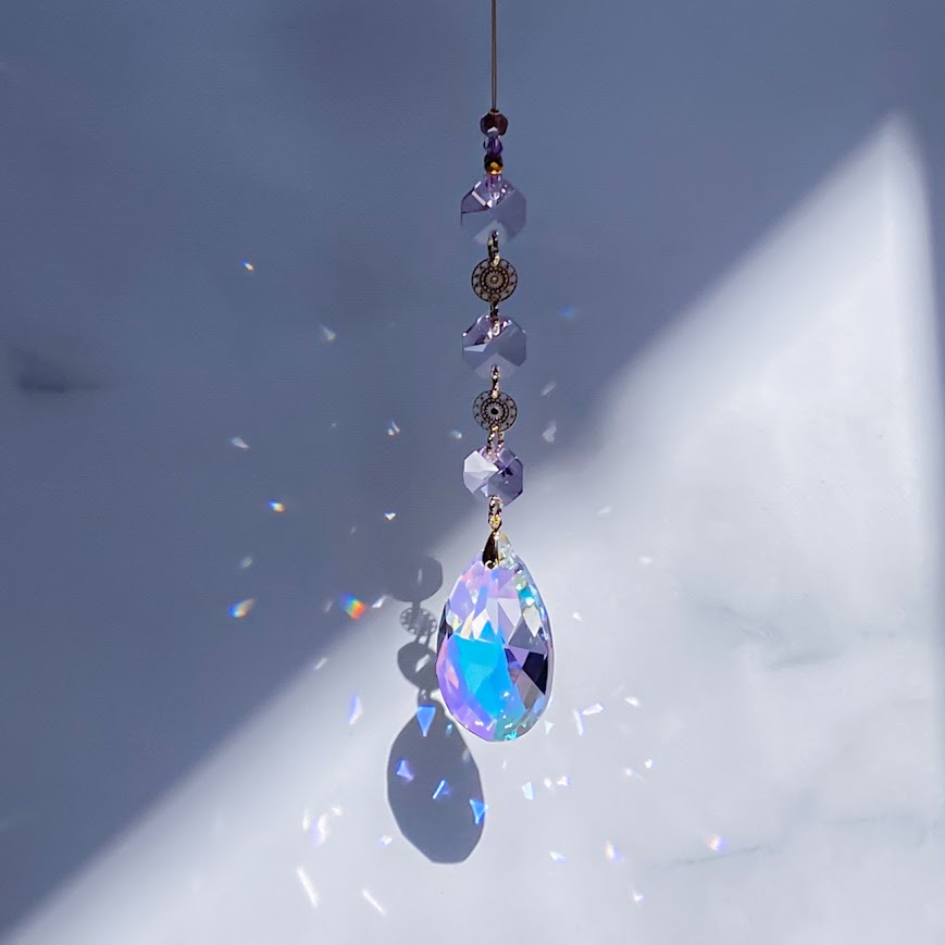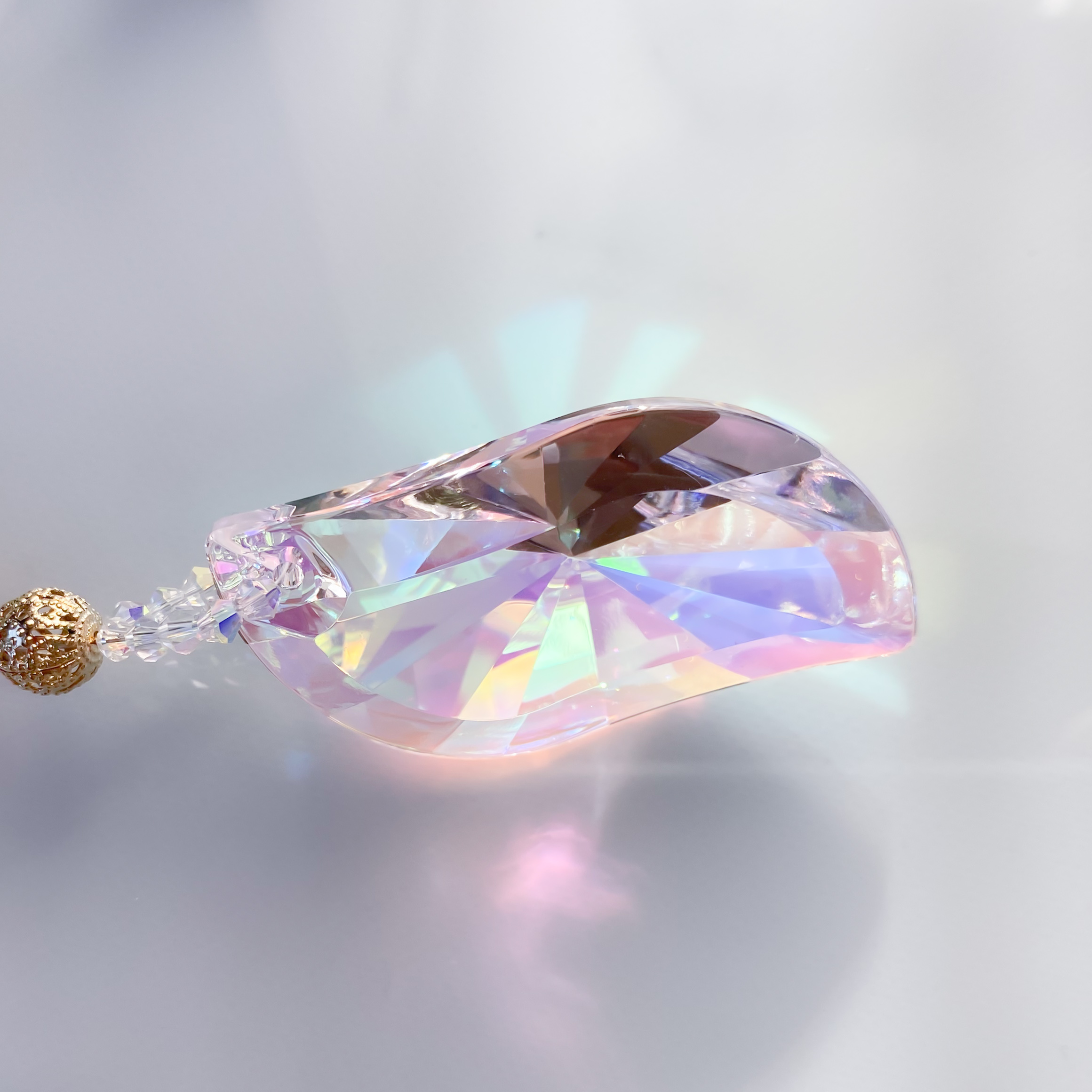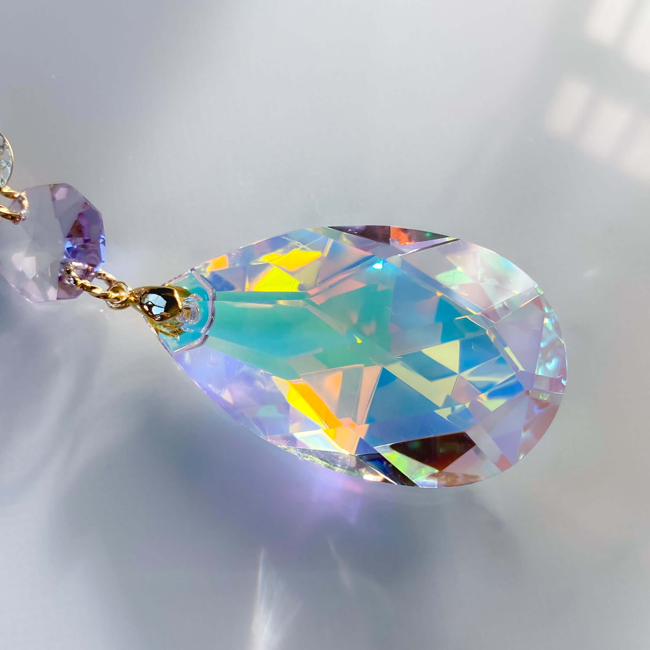 オーロラ加工のしずく型クリスタルを使っているので、光に当たるとキラキラの虹が出てとても綺麗です♪