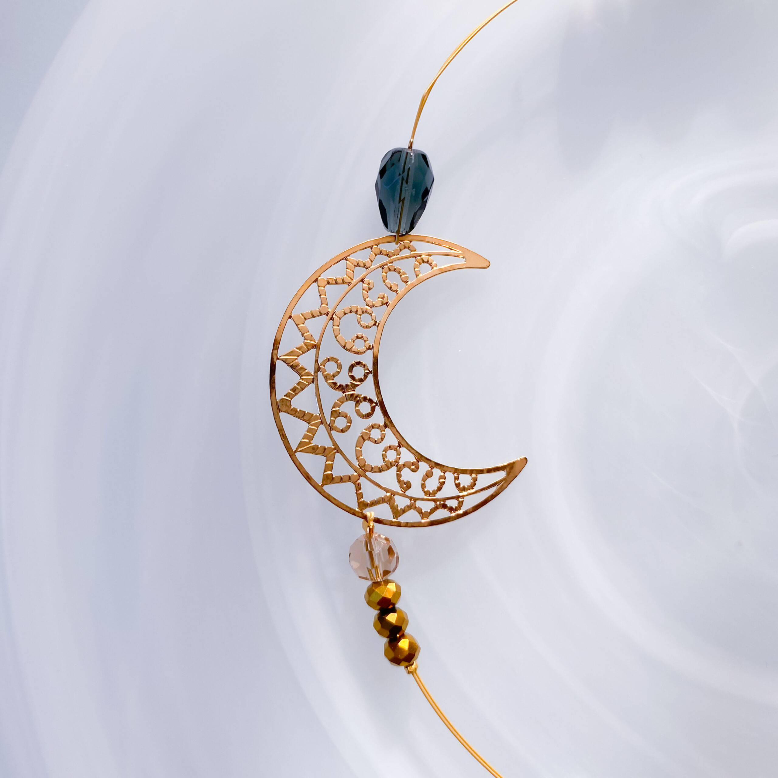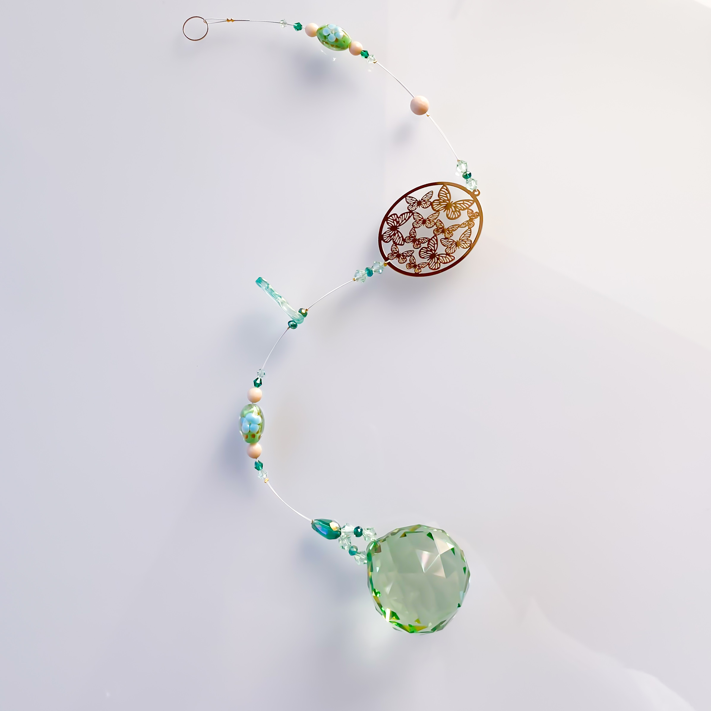 地球の大いなるエネルギーをサンキャッチャーの中に取り入れたかったので、植物が膨大な年月をかけて結晶化したオフホワイトの珪化木(けいかぼく)をところどころアクセントとして組み入れています。